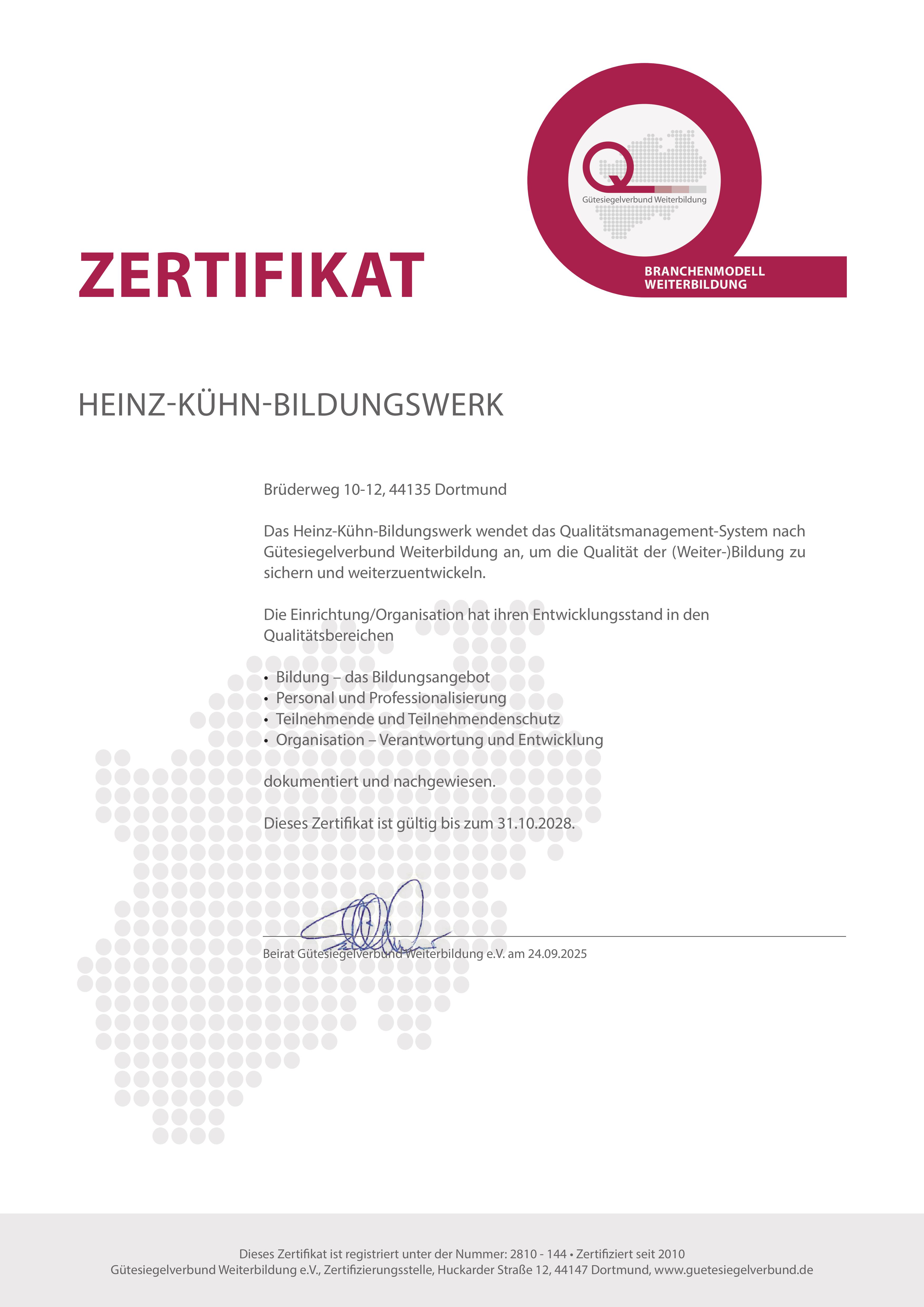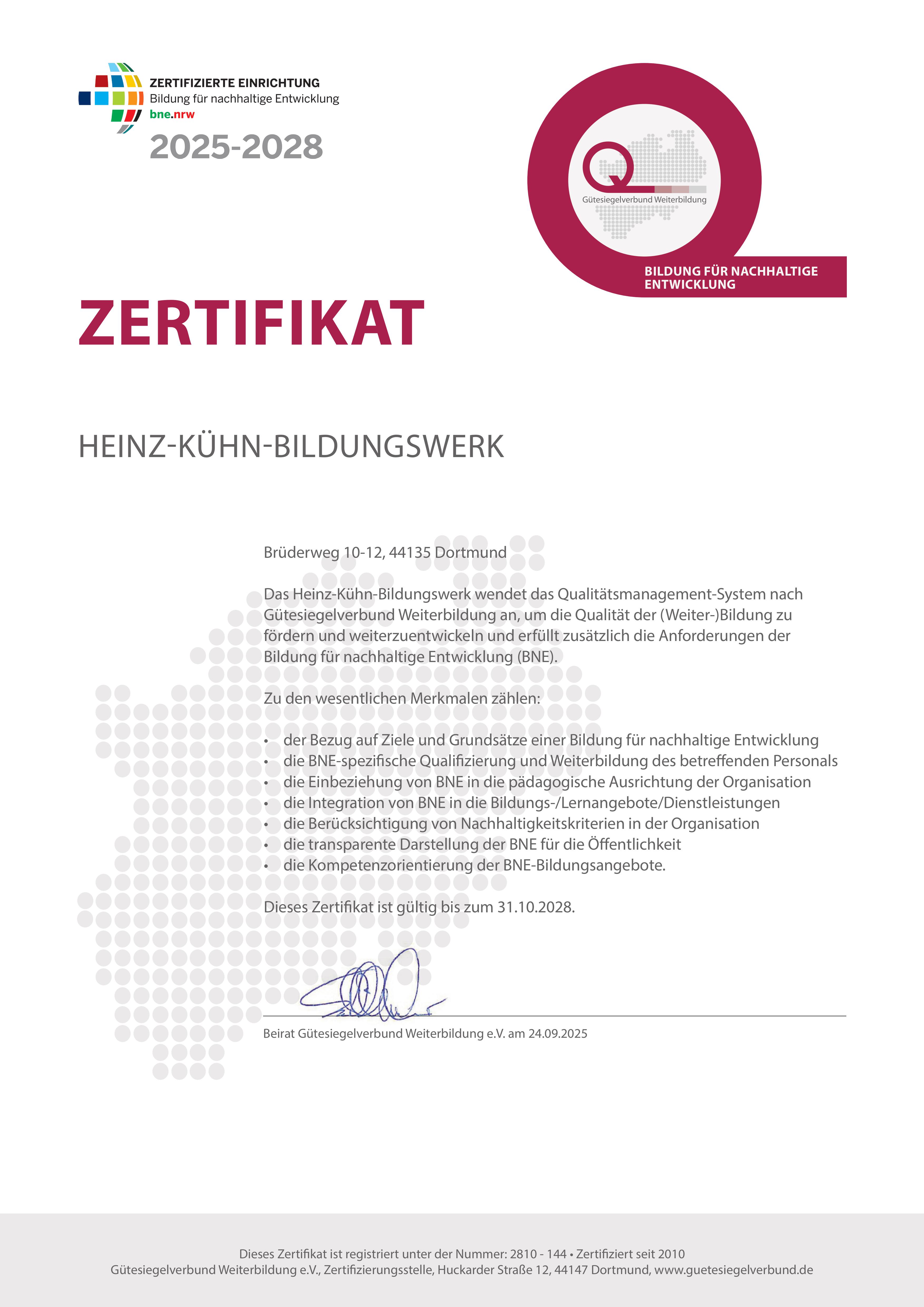 Das Heinz-Kühn-Bildungswerk hat am 01.10.2010 das Zertifikat für Qualität in der Weiterbildung erhalten. Die Rezertifizierung 2025 bestätigte die Qualitätsstandards des Bildungswerks.